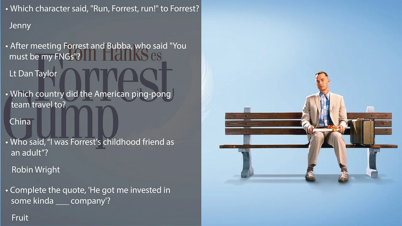 This session of Forrest Gump trivia questions is composed of questions related directly to the movie, quotes, and characters. If you have watched the movie then do not miss a chance to challenge your knowledge about the movie. It would really be helpful for you to blow your mind up with interesting facts about the movie.